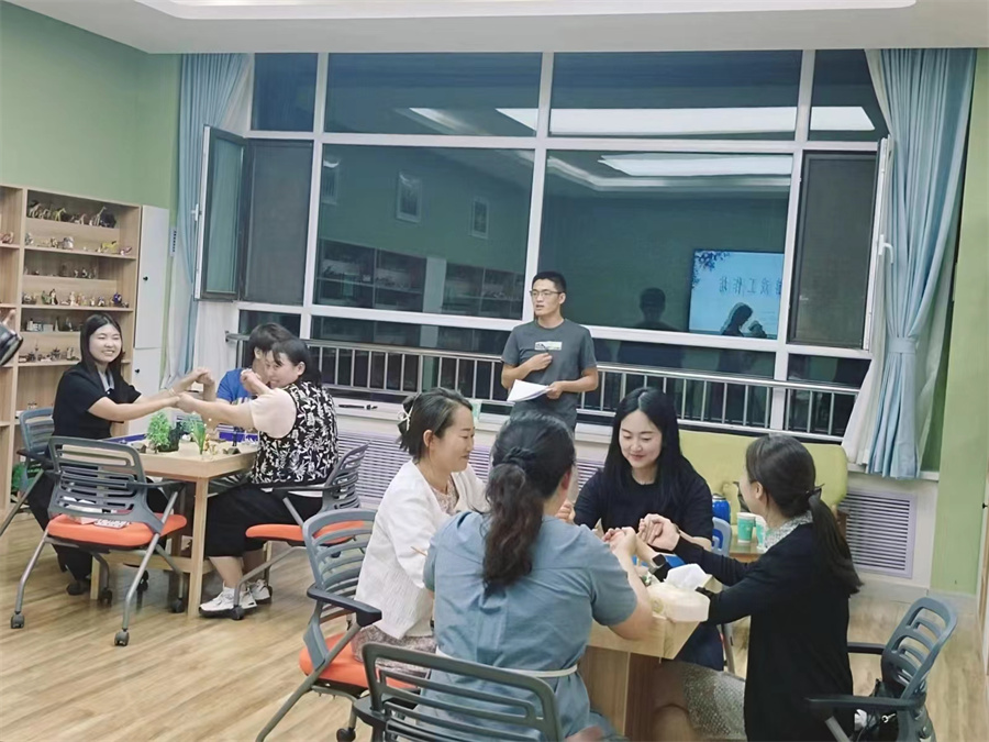 活动现场,心理教师组织老师们签署团体契约,通过游戏分组,寻找心动的沙具体验,宣读团体沙盘游戏指导语,开始团体沙盘游戏探索之旅,在分享中,参与者交流了彼此的创作历程,创作感受,以及最感兴趣的他人的创作部分,交流过程真挚诚恳,不作评价,活动最后,参与者做了告别许诺,进一步承诺带走自己的感受,留下他人的故事。本次活动的开展,参与教师不仅了解了更多的心理健康知识,丰富了个人成长的认识,更获得了与自己深度对话的机会,得到了心理疗愈与放松。