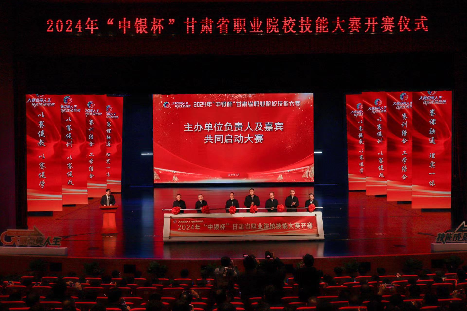 与会领导共同推动拉杆,“2024‘中银杯’甘肃省职业院校技能大赛”的卷轴徐徐拉开,2024年省赛正式开赛!