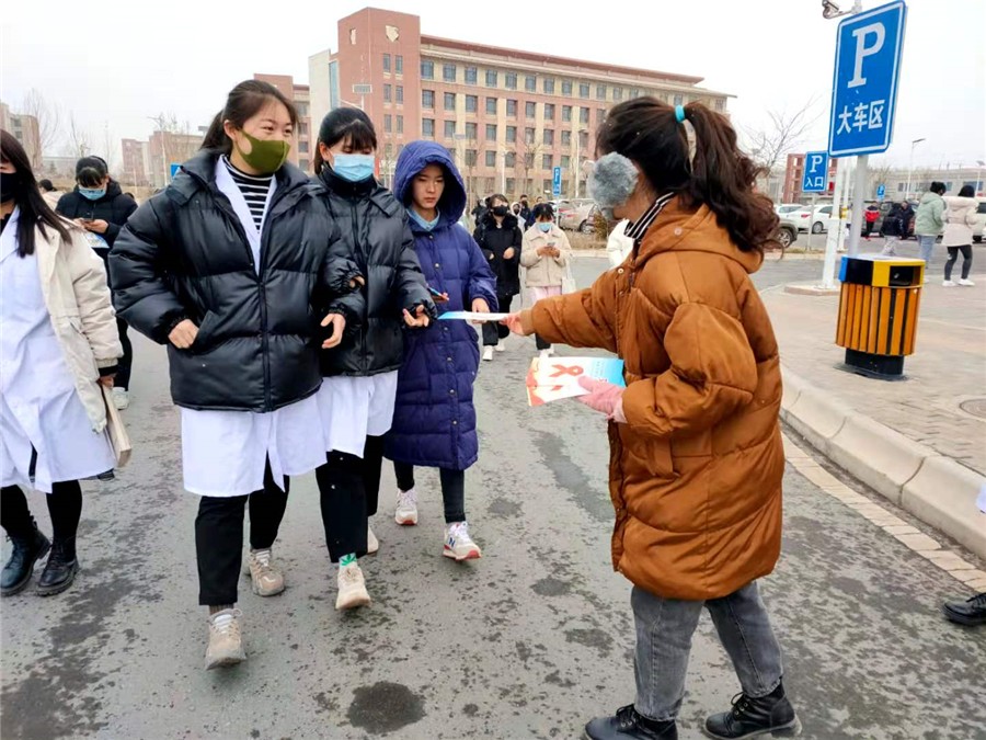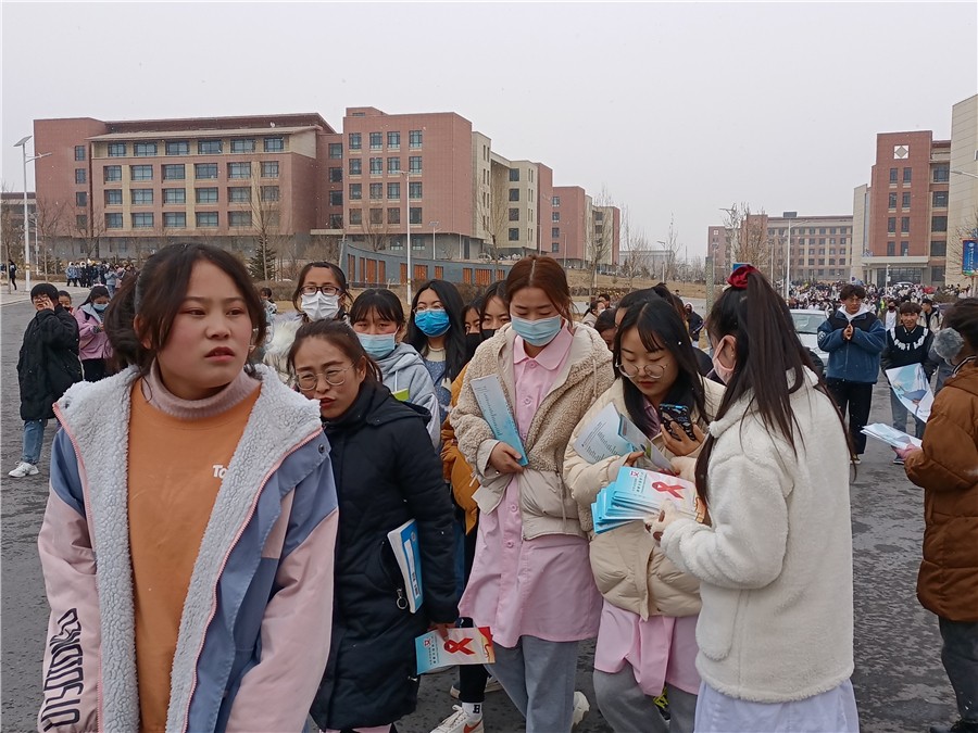 活动当天大雪纷飞,校医和同学们一起在食堂门口、教学楼、体育馆和宿舍楼向大家发放艾滋病宣传彩页,进行艾滋病相关知识宣教。宣教内容以艾滋病的预防为主,通过现场讲解来加强同学们对艾滋病的认识和关注,让同学们懂得如何保护自己。同时也教会学生怎样去对待艾滋病患者,消除对艾滋病病人和感染者的歧视,动员每一位同学参与到艾滋病预防和关爱艾滋病病人的活动中来。