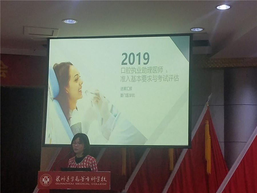 17日上午的大会由泉州医学高等专科学校口腔医学系主任丘东海主持会议。会上,泉州医学高等专科学校苏成安校长做了大会致辞,他指出本次会议的两个议题对于口腔医学专业的发展具有重要意义,学校是人才培养的大本营,口腔执业助理医师资格考试是学校人才培养质量考核的重要指标;国家医学考试中心何惧副主任、全国卫生职业教育教学指导委员会秘书长杨文秀分别做了专题讲话;国家医学考试中心王刚处长做了主题为《我国口腔类别执业医师考试二十一年工作基本情况回顾》的讲座。他以执业资格考试的准入基本要求和考试大纲的演变过程为线索,结合考生学历情况,深入地阐述了执业资格考试对学校人才培养的指导意义,并对下一步考试改革的方向进行了简要的解读;厦门医学高等专科学校赖颖真副教授做了《口腔职业助理医师准入基本要求与考试评估研究》课题汇报,该课题构建了口腔医学专业专科生“岗位胜任力”模型,并进行了反复的论证和全国范围内的调研,以期为口腔执业助理医师准入及考试改革提供建议。
