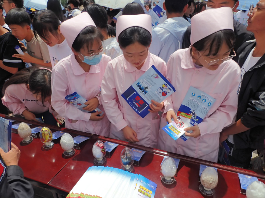 活动现场,艳阳高照,气温比较高,但同学们的热情仍然不减,踊跃观看各种禁毒教育知识展板,学习和掌握毒品防控的有关知识,特别是本次活动为了能够让大家更进一步的了解毒品的危害,认识新型毒品的外观,特提供了毒品仿真模型,极大提升了同学们的参与积极性和主动性。禁毒大队、西岔派出所警官就近年来伪装性越来越高的新型毒品类型进行现场讲解和说明,告诫师生明辨是非,提高对毒品诱惑的警惕性,采取坚决拒绝的态度,谨防误入歧途,给个人和家庭带来严重的危害。活动中保卫处准备了大量的禁毒宣传材料供师生分发学习。