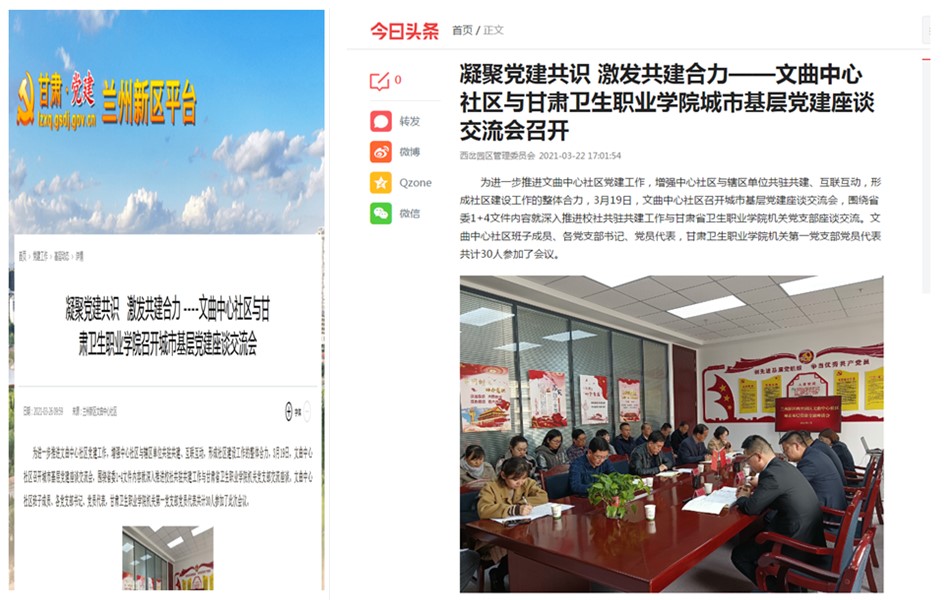 甘肃党建、今日头条平台报道威尼斯官网机关第一党支部与文曲中心社区党支部举办基层党建座谈交流会发布时间:2021-04-02 -